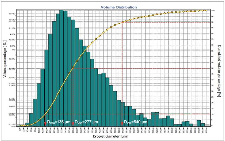 Средний объемный диаметр (MVD) – это средний показатель размера капель рассчитанный исходя из половины распыленного объема.