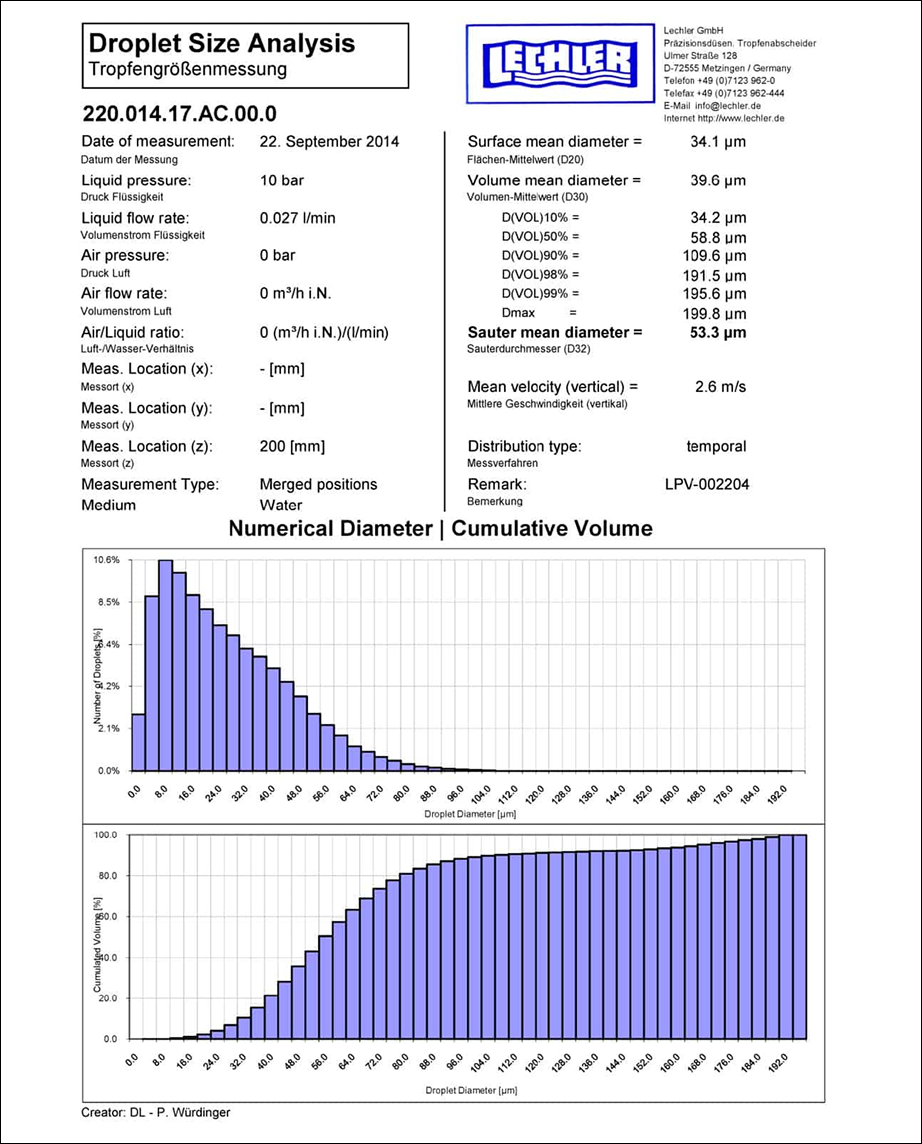 - размеры капель D20, D30, D32 и распределение капель по объему от DV10 до DV99, и Dmax.