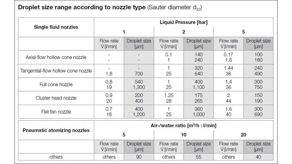 Используя формулу для среднего диаметра Заутера можно высчитать необходимый размер капель и подобрать форсунку правильного типа распыления и/или подобрать правильное рабочее давление, увеличив или уменьшив его (давление влияет на размер капель).