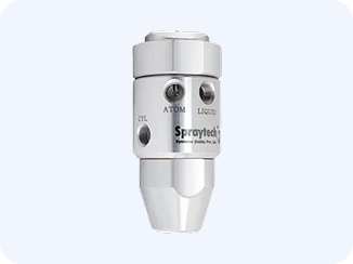 Пневматические атомайзеры с внешним смешиванием подходят для жидкостей с вязкостью более 200 сП. Потоки воздуха и жидкости выходят из сопла независимо через каждое отверстие, что обеспечивает точное дозирование жидкости. Этот метод лучше всего подходит для вязких материалов, таких как масла, покрытия, смазочные материалы, меласса, жиры.
