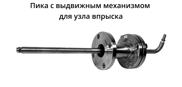 Пика – это труба с форсункой на конце. Пика устанавливается в зону распыления (узел впрыска), ее место установки известно заранее, благодаря проведенным расчетам для форсунки с учетом всех параметров. Пики бывают либо статическими, устанавливаются для постоянной работы в заданном направлении, корректировка которого может производиться только вручную, либо выдвижными, в которых форсунка на конце пики, в нужный момент, может выдвигаться в емкость/трубопровод.