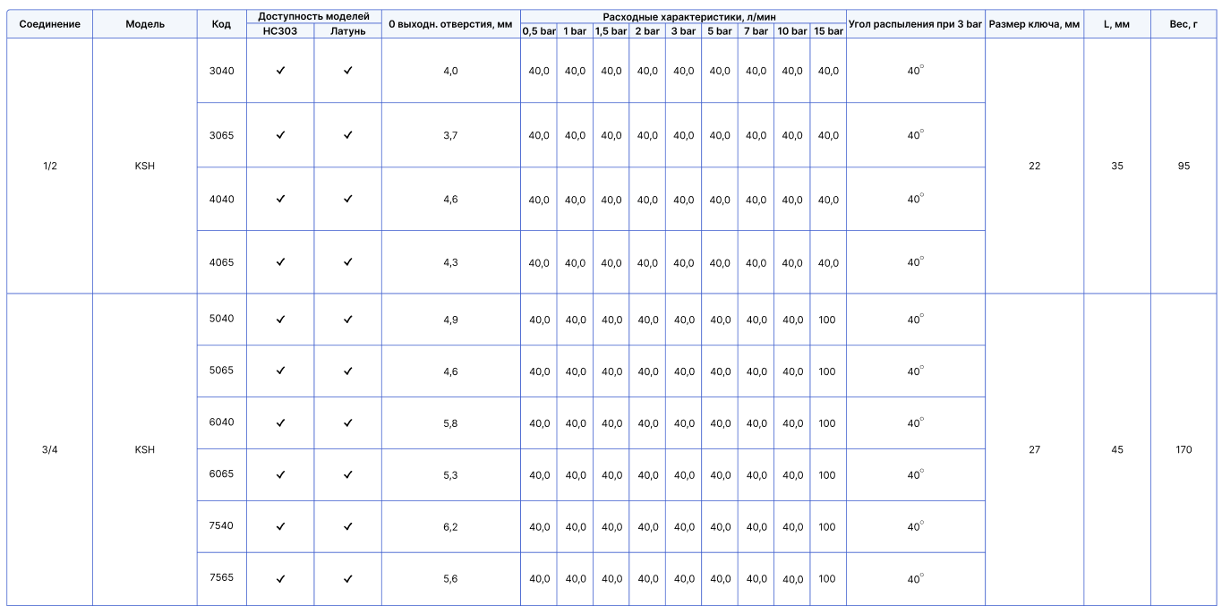 Форсунка KSH создает в процессе распыления плоскую струю треугольной формы. Форсунка KSH выполнена с наружной резьбой. Минимальное давление - 0.5 Бар, максимальное - 15 Бар. Минимальный расход - 1,63 л/мин, максимальный - 168 л/мин. Плоскофакельные форсунки KSH поставляются со следующими углами распыления - 40°, 65° и диаметром выходного отверстия - 1,3 - 6,2 мм. Стандартно, плоскоструйные форсунки KSH изготавливаются из Латуни и 303 нержавеющей стали. Благодаря плоскофакельным форсункам KSH достигаются высокие результаты в процессе очистки, а также при обработке любых поверхностей. Помимо этого, они показывают хорошие результаты там, где необходима равномерная и интенсивная водная струя.